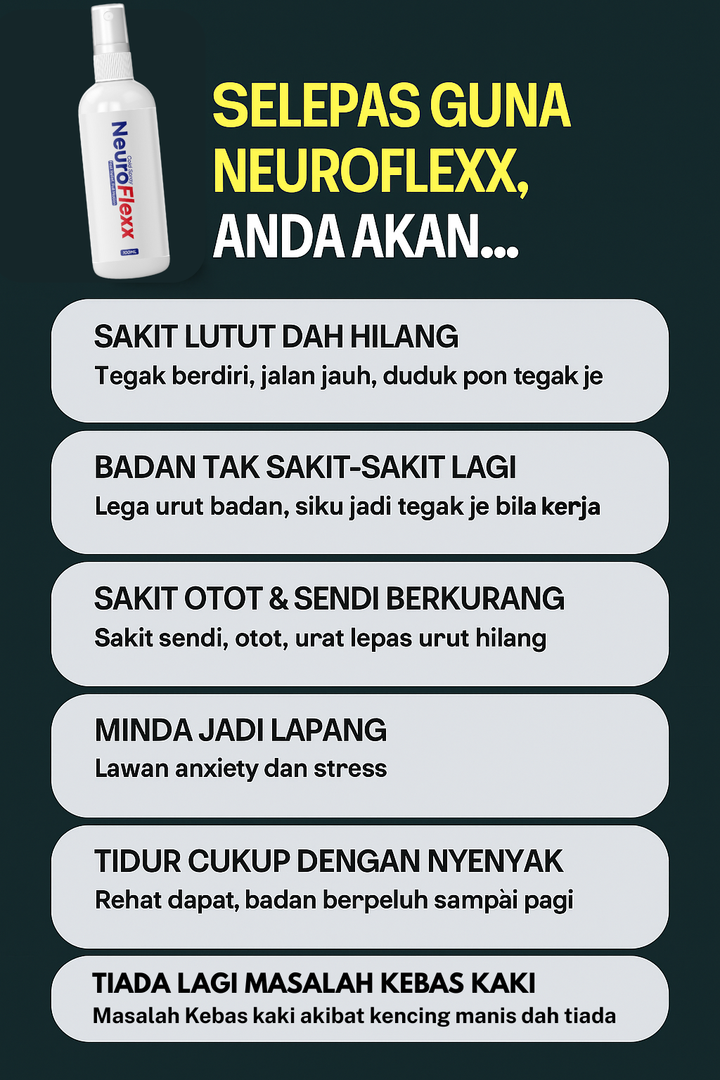 Maaf, Produk NeuroFlexx cold spray dengan Tablet Neuroflex by Excel Care ini adalah produk yang berlainan dan syarikat yang berlainan.